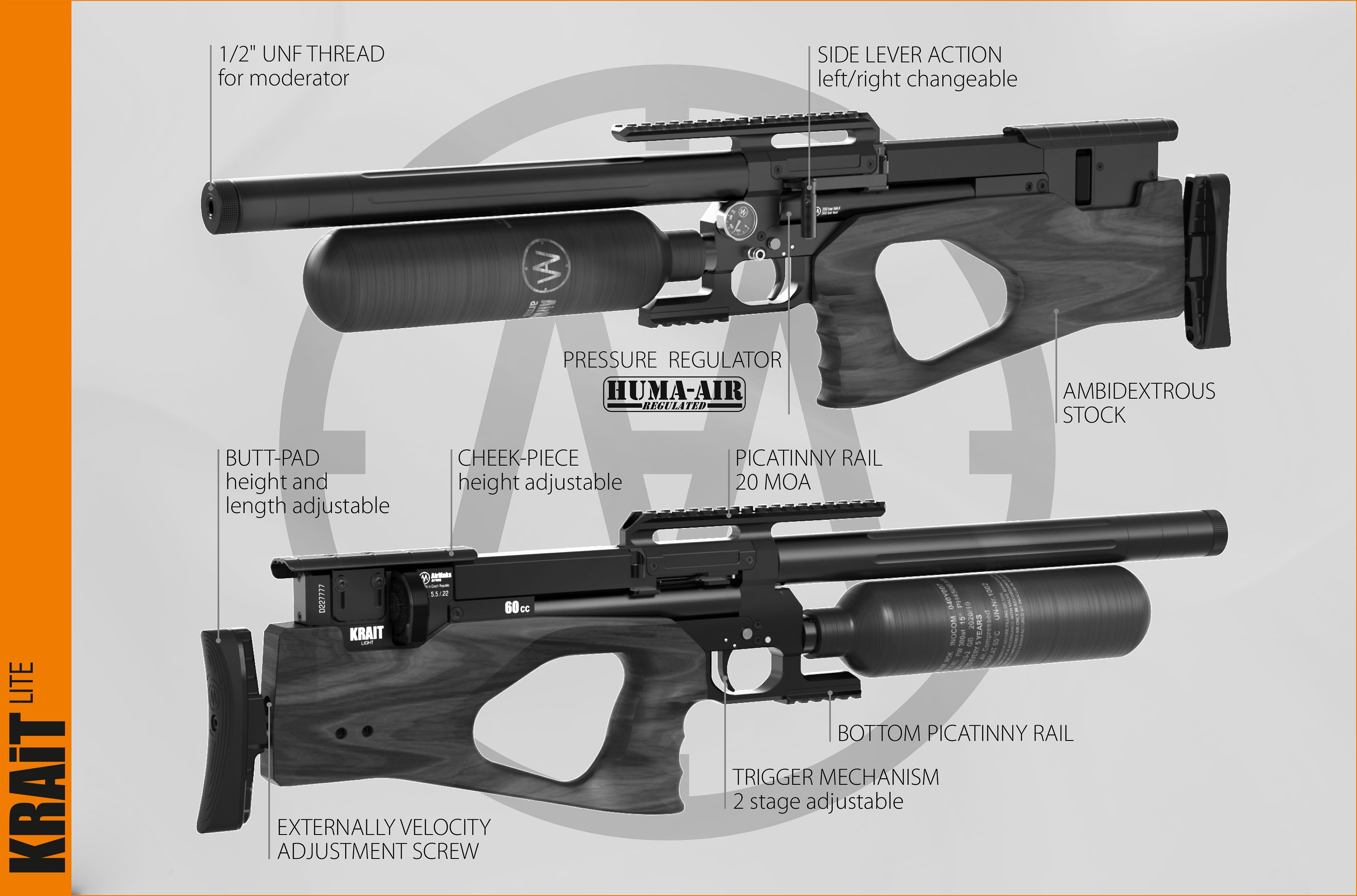 A Airmaks Krait Lite L é uma carabina bullpup PCP leve e de alto desempenho, perfeita para disparar projetos. Possui um mecanismo de gatilho de duas fases e uma alavanca lateral de ação reversível. O punho bonito e ergonômico em nogueira garante um ajuste confortável tanto para destros como para canhotos. Com um cano "Shroud", módulos amovíveis e múltiplas calhas Weaver/Picatinny para acessórios táticos, o Krait Lite é versátil e potente, com um plenum de potência de 60 cc mais uma garrafa de ar de fibra de carbono de 580 cc.