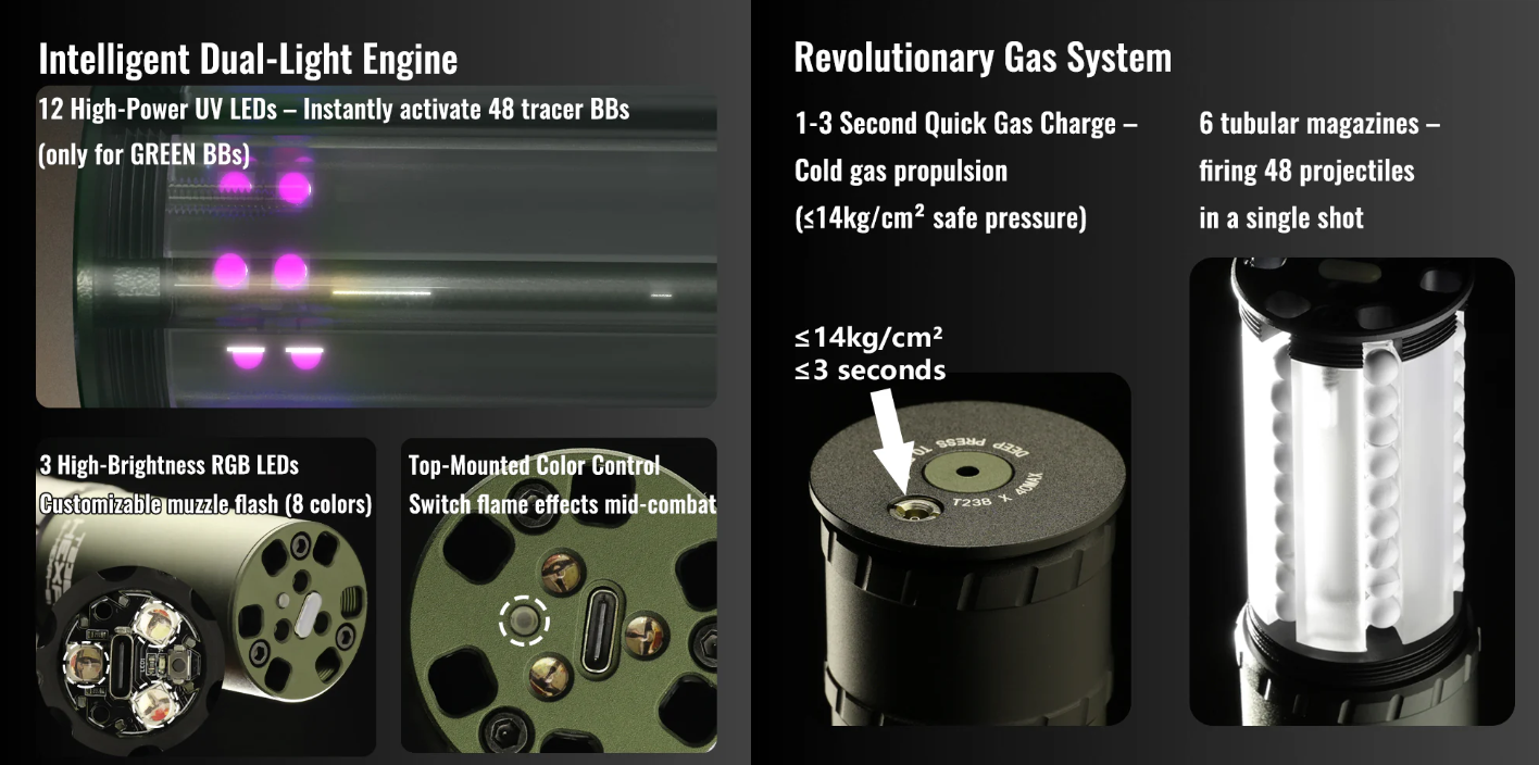 ✔ Ativação de BBs/Bolas de Gel Tracer – LEDs UV integrados carregam instantaneamente BBs/bolas de gel tracer em pleno voo para rastreamento visível da trajetória!