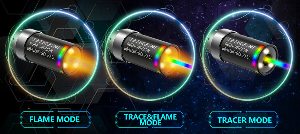 A unidade traçadora T238 RGB+ foi projetada para lançadores de dardos/bolas de gel BB/NERF. Ela é acoplada ao seu lançador, permitindo que sua bola de dardos/bolas de gel BB/NERF brilhe no escuro. Para ver a trajetória do seu tiro, são necessárias BBs/dardos/bolas de gel traçadoras especiais. Ao usar a versão RGB+, você ainda pode ver um arco-íris de efeitos de tiro sem a ajuda de balas especiais.